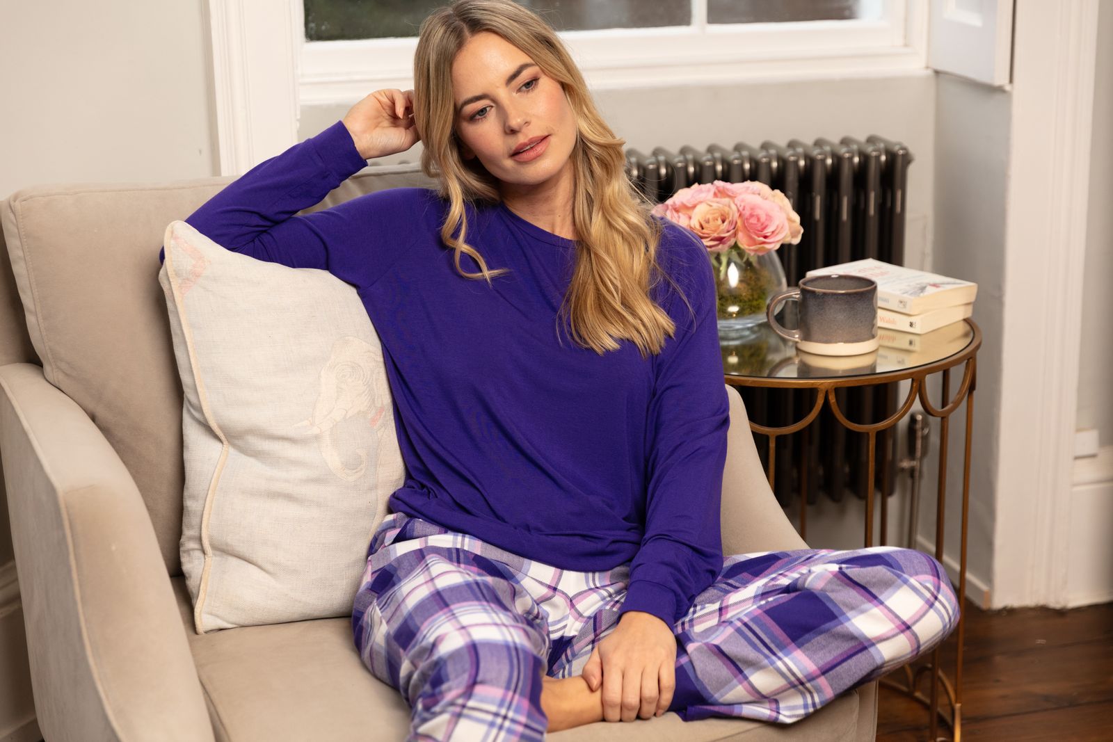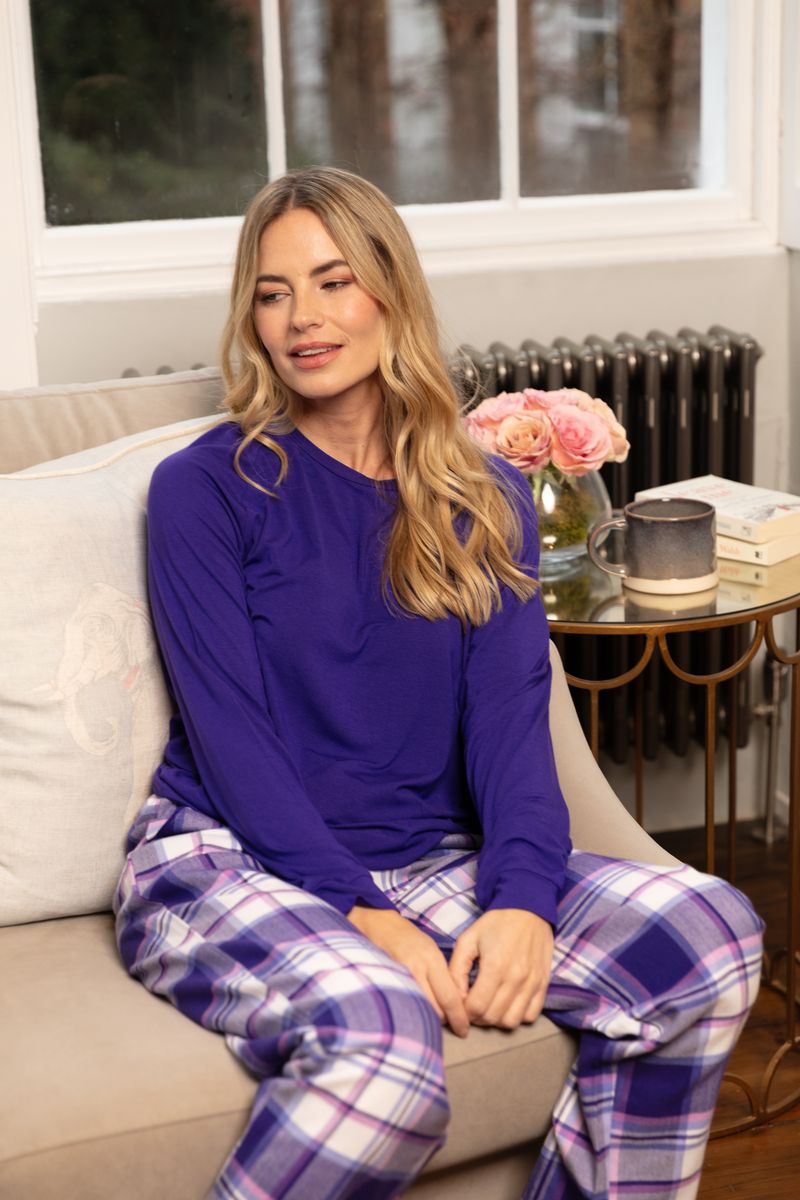 For relaxation time that promises softness in every sense of the word, there are few better choices than our Evolet Purple Slouch Jersey Long Sleeve Top and Purple Mix Brushed Check Pyjama Set. Combining a slouchy, purple-all-over pyjama top with breathable, 100% cotton check pyjama bottoms, this set is the go to choice for evenings without a rush, without fuss - just a slow settling in as the day winds down. The top, with its cuffed sleeves and a round neckline keep things casual, while the soft purple tone and pink modal neck tape soothe the senses before sleep has even begun. The bottoms meanwhile, have a gently-tapered leg that flatters without restricting, and details like a flat-front waistband, elasticated back, and practical side pockets to ensure comfort never comes at an expense. Together, they create a set made for the winding down hours. Whether you're closing the door on a busy day or easing into a quiet morning, this set is your signal to soften the pace and sink into comfort.