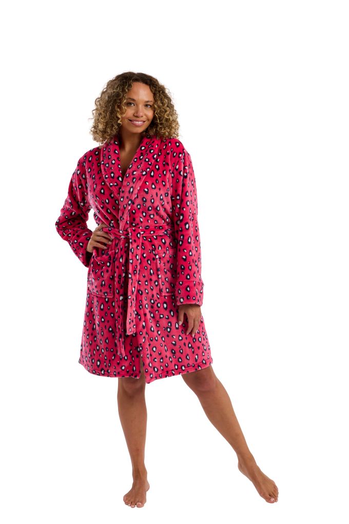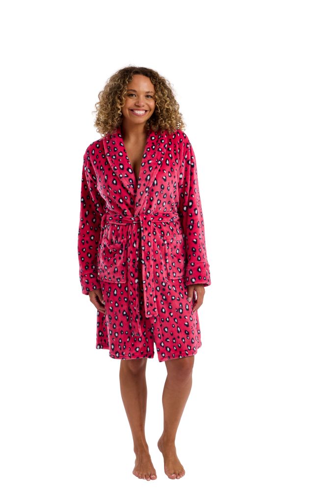 Soft and fluffy knee length wrap in cerise pink with navy animal print.